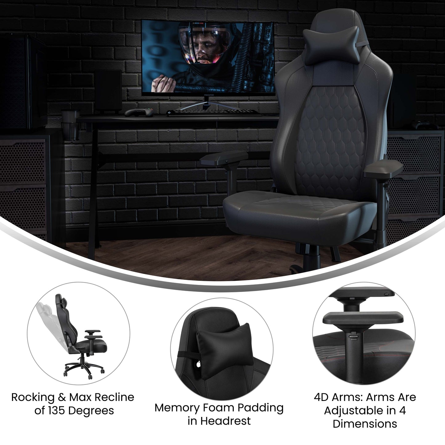 Falco Ergonomic High Back Adjustable Gaming Chair with 4D Armrests, Headrest Pillow, and Adjustable Lumbar Support, Black with Black Stitching Dimensions: 28.75"W x 25.5" - 46.5"D x 48.75" - 51.25"H