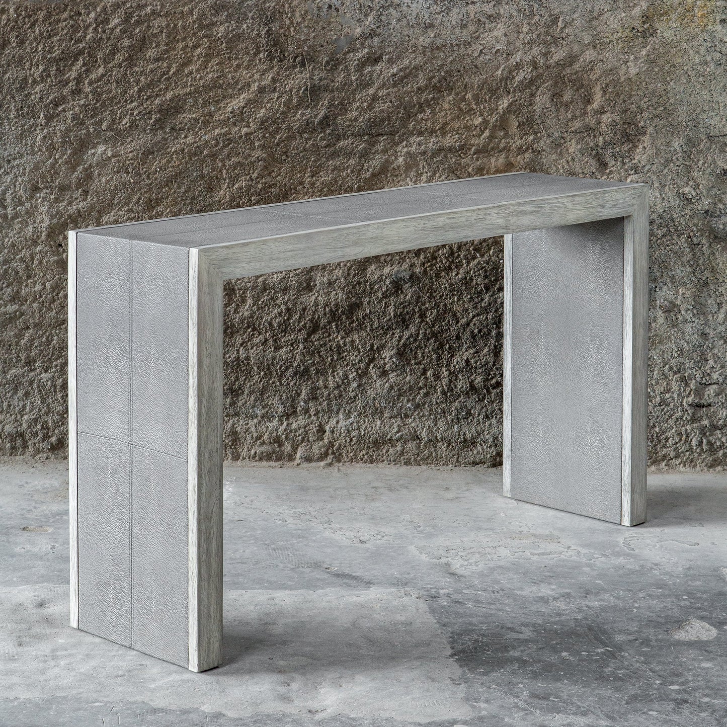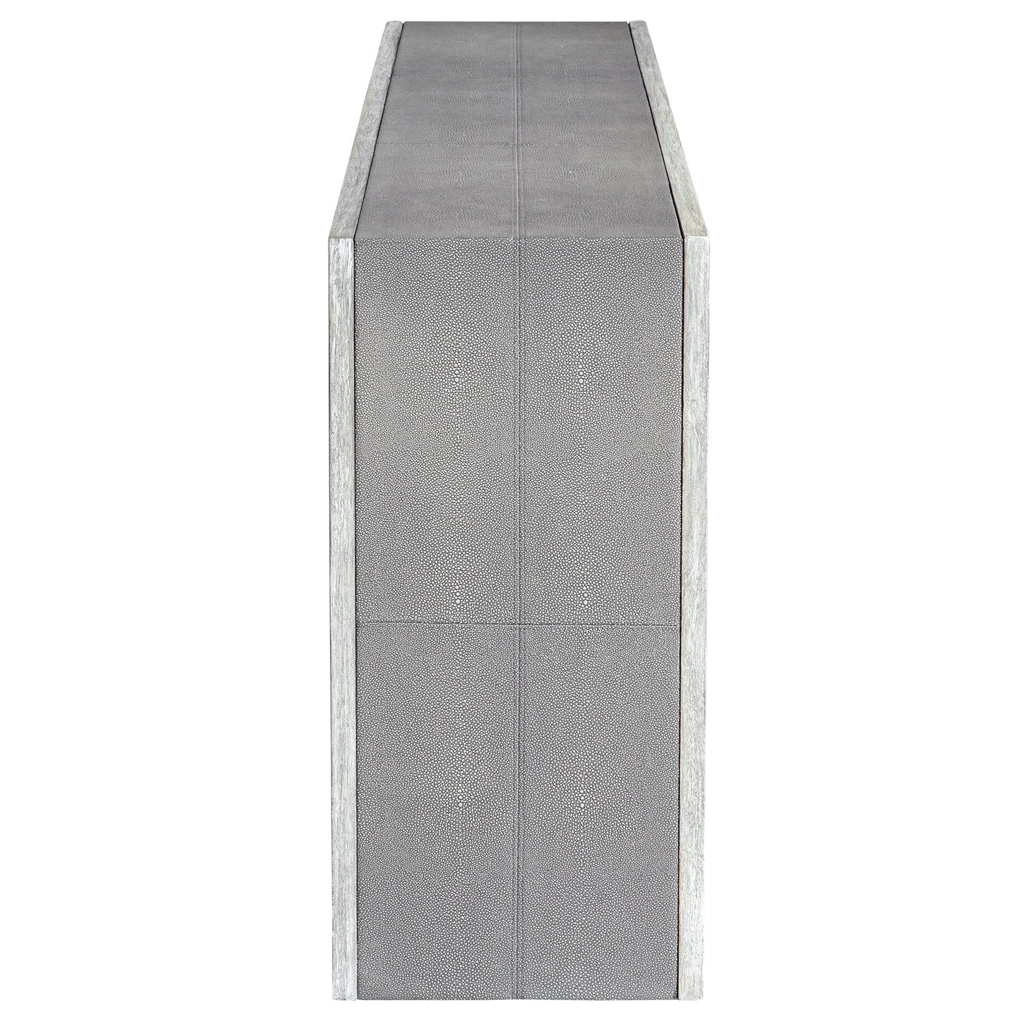 With Modern Elements, This Transitional Console Features Stitched Panels Of Light Gray Faux Shagreen, Paired With A Contrasting Wood Finish In A Aged White With Gray Distressed Details. Overall Depth : 15 in Overall Width : 60 in Overall Height : 33 in
