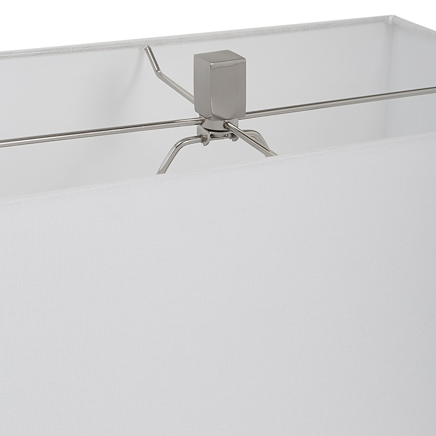 Stylish And Sophisticated, This Table Lamp Is Executed In A Rich Carved Ivory Man-made Stone That Accurately Replicates The Look Of Thassos Marble And Is Accented By Brushed Nickel Finished Iron Details. A Rectangle Hardback Shade In White Linen Complements The Design. Overall Depth : 10 in Overall Width : 17 in Overall Height : 32 in